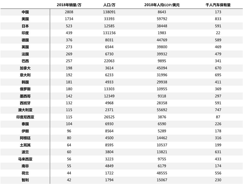 下表为2018年全球汽车销量排在前25名的国家的汽车销量、人口、人均GDP和千人汽车保有量数据: