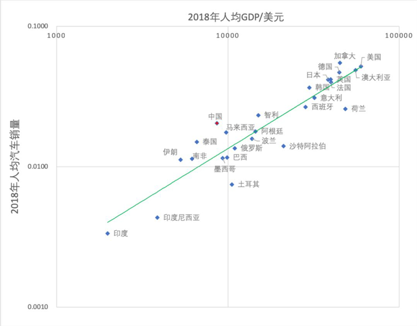 而通过下面的散点图可以看出,即使在2018年,相对于人均GDP水平,中国的人均汽车销量仍然偏高,是主要汽车销售国中偏离拟合线最远的国家。而这已经是建立在人均GDP相对于2017年有所增长、人均汽车销量却有所下降的前提下了。