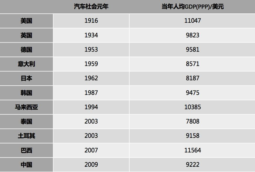 首先,各国进入汽车元年的时间,即汽车销量超过全国人口百分之一的时间,普遍在按购买力折算的人均GDP达到1万美元上下时。