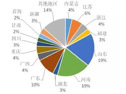 2018年中国铝材产量分布(万吨)
