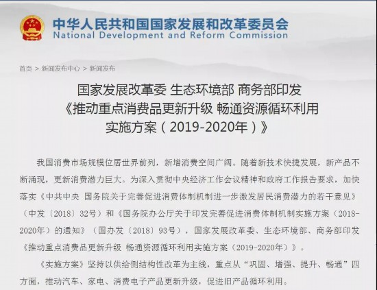 6月6日,国家发改委、生态环境部、商务部等三部门联合印发《推动重点消费品更新升级畅通资源循环利用实施方案(2019-2020年)》(以下简称《方案》)。