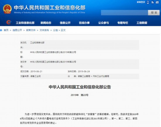 今年6月下旬,工信部发布2019年第22号公告,决定自2019年6月21日起废止《汽车动力蓄电池行业规范条件》(以下简称《条件》)(工业和信息化部公告2015年第22号),第一、第二、第三、第四批符合规范条件企业目录同时废止。