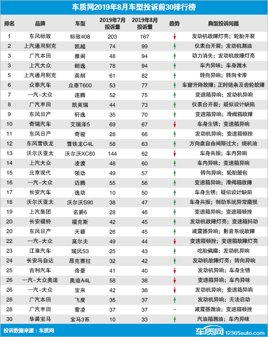 据国内领先的缺陷汽车产品信息收集平台车质网统计,2019年8月共接到车主有效投诉信息7440宗,环比上涨5.5%,同比依旧保持着两位数的增长,较去年同期上涨19.9%。数据显示,本月车质网接到的有效投诉信息共涉及663款车型,其中投诉达两位数(含)以上的车型150款。此外,8月份共接到车企针对投诉回复反馈6961条(含部分7月份投诉的回复)。在去除投诉人因为车企解决得当而自愿申请撤诉的信息后,2019年8月投诉量前30的车系(车型)排名如下: