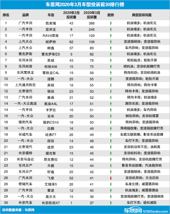 尽管新冠病毒对国内车市的冲击巨大,但受3.15消费者权益日的惯性影响,3月国内汽车消费者投诉意愿依然强烈,投诉量环比大幅反弹。纵观整个榜单,仅有广汽本田飞度投诉量环比出现下降,其余车型投诉量均较2月份出现较大涨幅。本月,“机油增多”和“机油乳化”故障问题成为投诉焦点,导致部分日系品牌车型投诉量出现异常,榜单前三名均为日系品牌车型。此外,大众集团旗下大众和奥迪品牌本月共有8款车型进入榜单,均为品牌旗下主销车型,投诉主要体现在变速箱问题上。其中,探岳在经过2019年12月份的投诉高峰后再次迎来反弹,投诉焦点仍为“车灯不亮”。