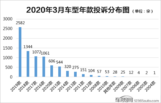 3月,2019款车型仍为投诉最多的年款车型,投诉量已突破2000宗,投诉体量大幅领先于其他各年款车型。受部分德系和日系品牌车型投诉量小范围增多影响,2018款车型重回第二名的位置,投诉量环比上涨1.7倍。本月,2020款车型排名再进一位,投诉量也创造了历史新高,逐步成为第二梯队领头羊。