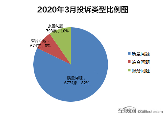 车质网接到的投诉主要分为质量问题、服务问题及综合问题三大类。2020年3月份单纯质量问题投诉量重返6000宗,占比依旧超过八成。本月服务问题投诉量出现大幅增长,刷新历史同期最高纪录。