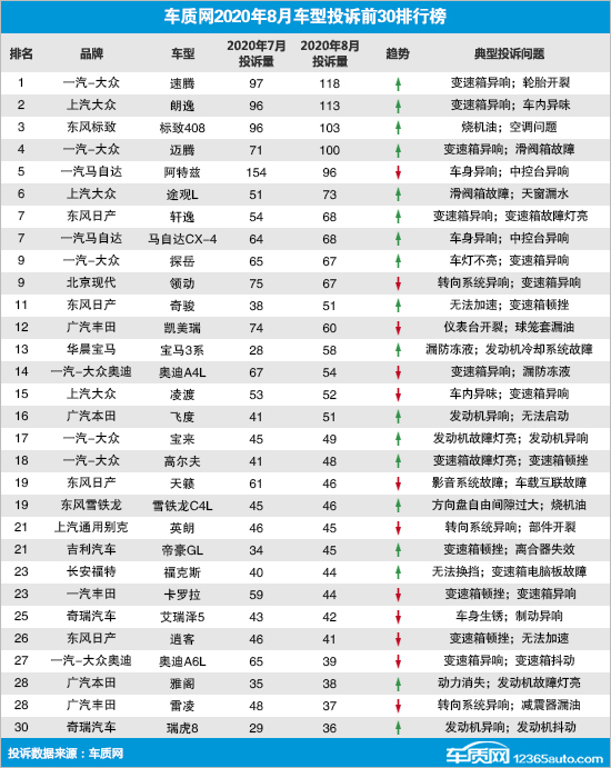 数据显示,本月车质网接到的有效投诉信息共涉及714款车型,其中投诉达两位数(含)以上的车型139款。此外,本月车质网共接到车企针对投诉的回复10,426条(含部分之前月份投诉的回复)。在去除投诉人因为车企解决得当而自愿申请撤诉的信息后,2020年8月投诉量前30的车系(车型)排名如下: