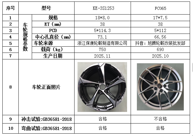 2025年11月,铝车轮质量协会抽查了市场上销售的2款铝合金车轮产品。依据国家强制标准GB36581-2018 《汽车车轮安全性能要求及试验方法》,对此2款车轮,委托江苏东方轮毂检验检测中心有限公司首先对车轮上5项永久标识(车轮制造商的识别标记;轮辋规格代号;偏距;车轮额定载荷;生产日期)进行核对,同时按照车轮上标注的载荷数值对2款车轮进行弯曲疲劳试验、冲击试验二项性能指标检测。检测结果为1款车轮冲击试验和弯曲疲劳试验合格,1款车轮冲击不合格,弯曲疲劳试验合格,具体检测结果见附表《2025年11月铝合金车轮质量抽查检测报告》。