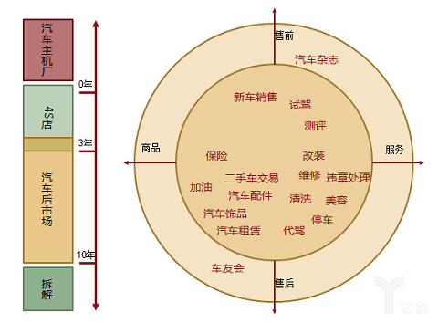 销售前的服务或者产品主要有新车销售、保险,销售之后主要有熟悉的加油、二手车交易、汽车饰品、租赁,有维修、违章处理、清洗、美容违章代驾等领域。