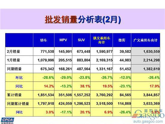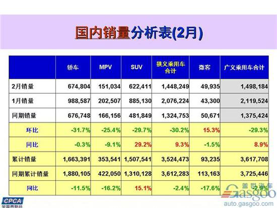 细分领域,轿车、MPV车型和SUV车型与1月销量环比出现大幅度下跌,其中轿车销量下滑最为严重为31.7%、MPV车型下滑25.4%、SUV车型下滑29.7%。而与去年同期相比SUV车型销量抢眼,同比大涨29.2%。