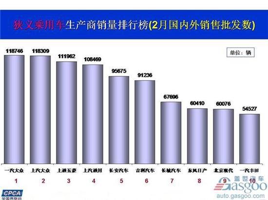 在2月前十车企座次排名中长安汽车、吉利汽车、北京现代与1月销量排名保持一致,其他车企排名发生显著变化。具体来看,前三名分别由一汽大众、上汽大众和上通五菱夺得,而这三家车企销量环比上月均出现下跌。而在合资品牌中,一汽丰田较为“意外”将上月排名第十的长安福特“挤下”排行榜,位列第十。