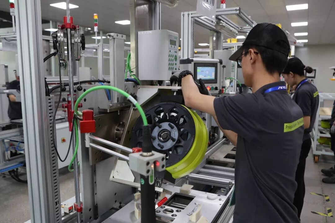 该合装总线自2016年8月份开始进行前期规划与方案设计,由亚太智能装备公司、亚太依拉菲公司和斯洛文尼亚依拉菲公司三方,历经16个月的研究探索与反复试验,最终成功圆满的达成了所有设计目标,设计产能为20万只/年,可实现公司目前所有主流外转子轮毂电机(涵盖S400,M700,M1100, L5000等四个系统多种型号的轮毂电机)的柔性化生产,是目前国际上第一条适应大批量生产的外转子轮毂电机装配线。