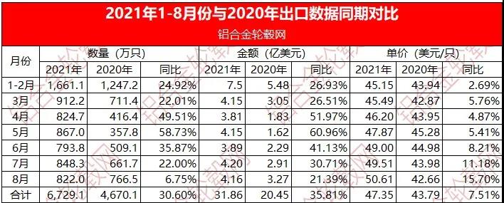 2021年8月中国铝合金车轮出口822万只(按10Kg/只计算,下同),1-8月累计出口6729.1万只,8月出口4.16亿美元,1-8月累计出口31.86亿美元。详见下表: