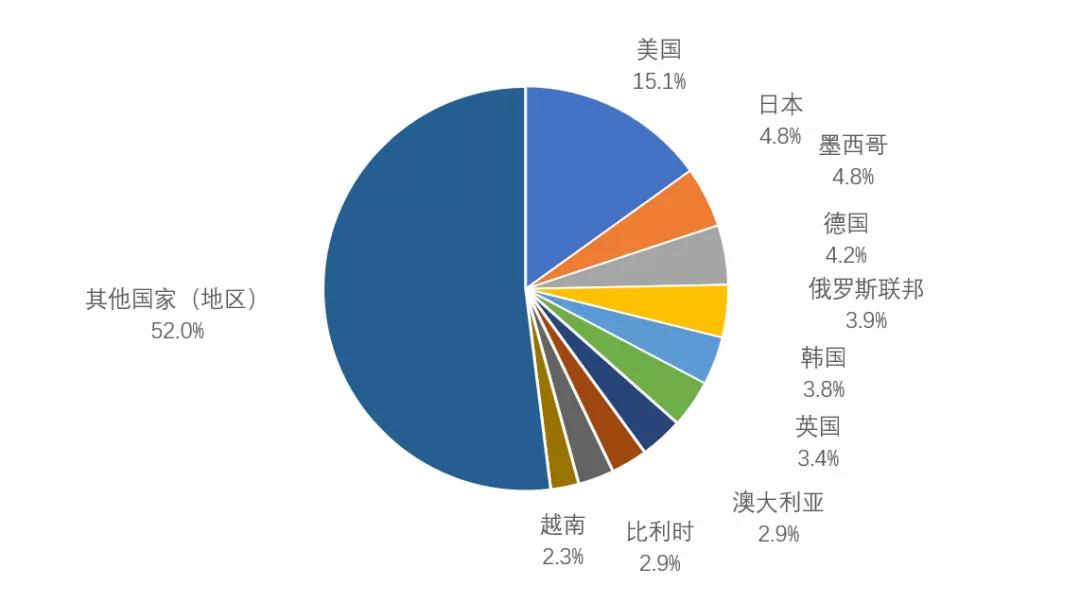据中国汽车工业协会整理的海关总署公布的数据分析,2021年1-9月,中国汽车商品出口金额排名前十位国家依次是美国、日本、墨西哥、德国、俄罗斯联邦、韩国、英国、澳大利亚、比利时和越南。
