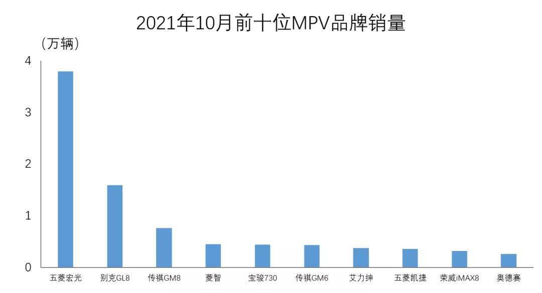 据中国汽车工业协会统计分析,2021年10月,销量排名前十位的MPV品牌依次是:五菱宏光、别克GL8、传祺GM8、菱智、宝骏730、传祺GM6、艾力绅、五菱凯捷、荣威iMAX8和奥德赛。