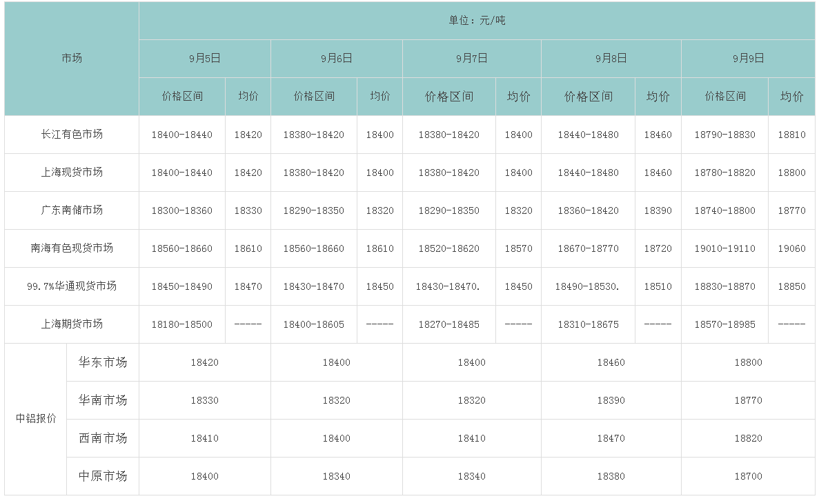 9月5日~9月9日各大市场近五个交易日铝锭价格表