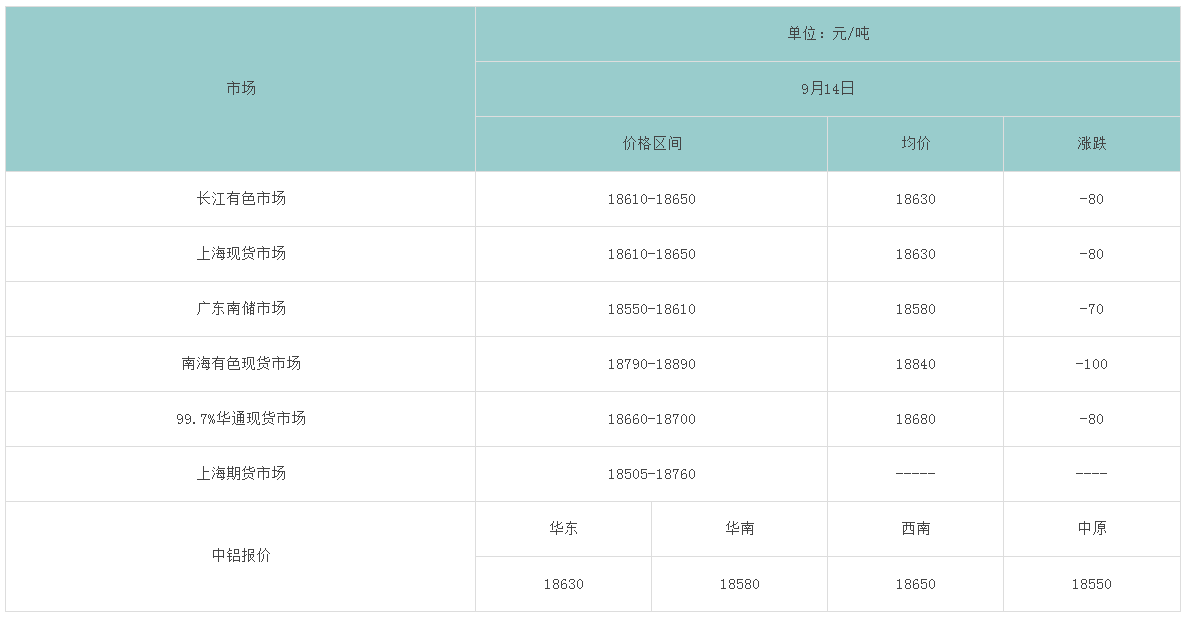 9月14日各大市场铝锭价格表