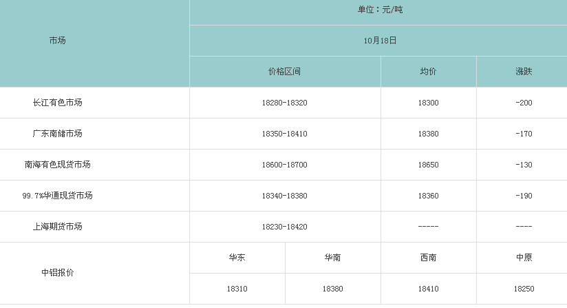10月18日各大市场铝锭价格表