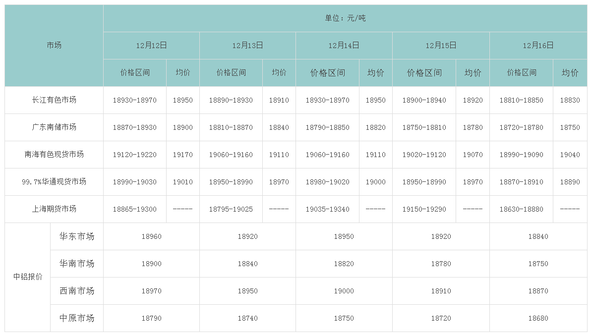 12月12日~12月16日各大市场近五个交易日铝锭价格表