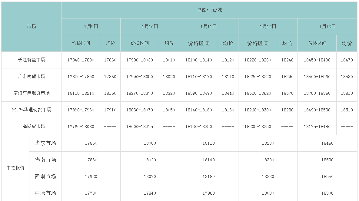 1月9日~1月13日各大市场近五个交易日铝锭价格表