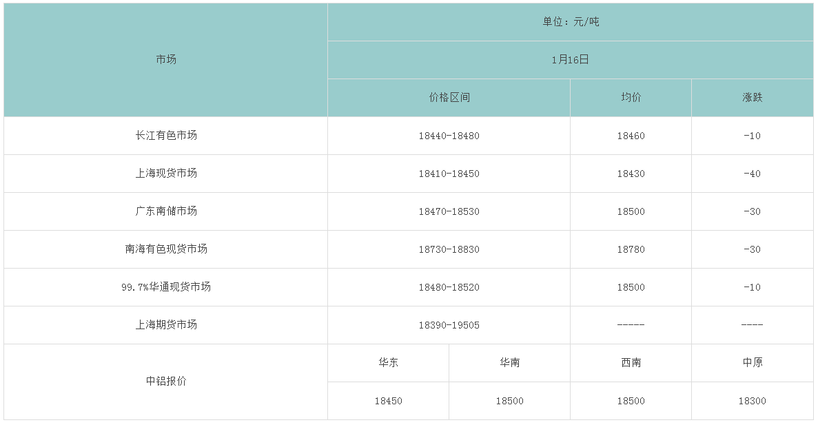 1月16日各大市场铝锭价格表